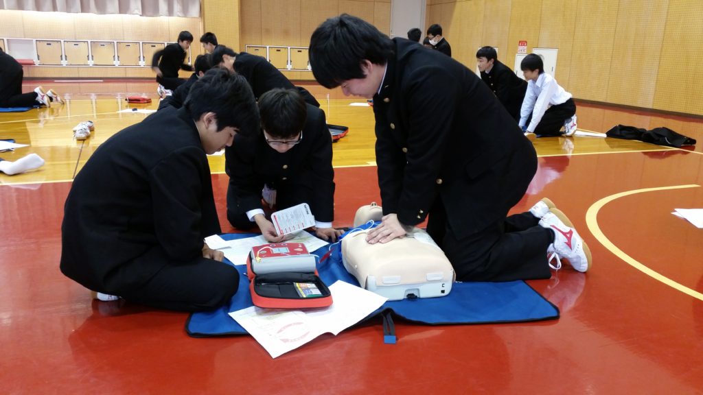 本校では、毎年豊橋ハートセンターの杉浦武治先生を講師にお招きし心肺蘇生実習を行っています。