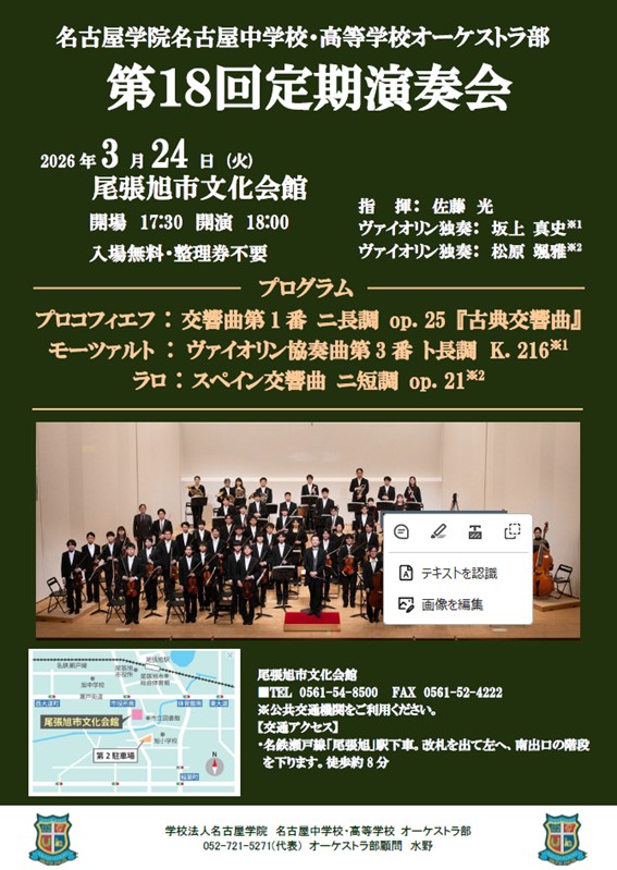 名古屋中学校・高等学校オーケストラ部の第18回定期演奏会を、3月24日(火)18時より(17時30分開場)、尾張旭市文化会館にて開催いたします。今回のプログラムは、プロコフィエフ作曲 交響曲第1番 ニ長調《古典交響曲》、モーツァルト作曲 ヴァイオリン協奏曲第3番 ト長調、そしてラロ作曲 《スペイン交響曲》ニ短調をお届けいたします。モーツァルトでは高校2年の坂上真史君、ラロでは同じく高校2年の松原颯雅君がヴァイオリンのソロを務めます。趣の異なる三作品を通して、それぞれの音楽の世界観を存分にお楽しみいただけるプログラムとなっております。皆さまのご来場を、部員一同心よりお待ちしております。ぜひお誘い合わせの上、お越しください。