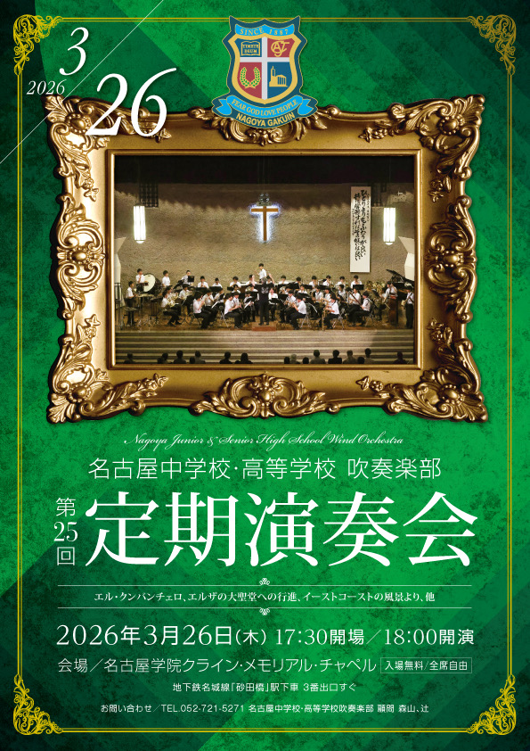 2026年3月26日(木)午後6:00より、本校チャペルにて吹奏楽部定期演奏会が開催されます。第一部はアーセナルやエルザの大聖堂への行進、等の吹奏楽の定番曲。第二部はソロ、アンサンブルのステージ。第三部はエル・クンバンチェロ、やパイレーツ・オヴ・カリビアン等のポップスステージ。OBも賛助で参加し、元気のある楽しいステージをお届けします。是非、足をお運び下さい。尚、公共交通機関でのご来場をお願い致します。