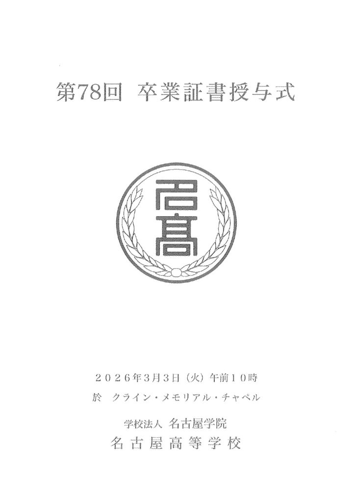 第78回 卒業証書授与式 2026年3月3日(火) 午前10時 クライン・メモリアル・チャペル 名古屋高等学校の卒業式が行われました。 恵みの雨、生徒たちは晴れやかな笑顔で卒業証書を受け取りました。 保護者や教職員も参加し、感動的な一日となりました。 ご卒業おめでとうございます。 投稿日: 2026-03-03 (2026-03-03) 投稿者: %s 塚田光幸 カテゴリー: 高等学校 2026年度 高等学校説明会のご案内