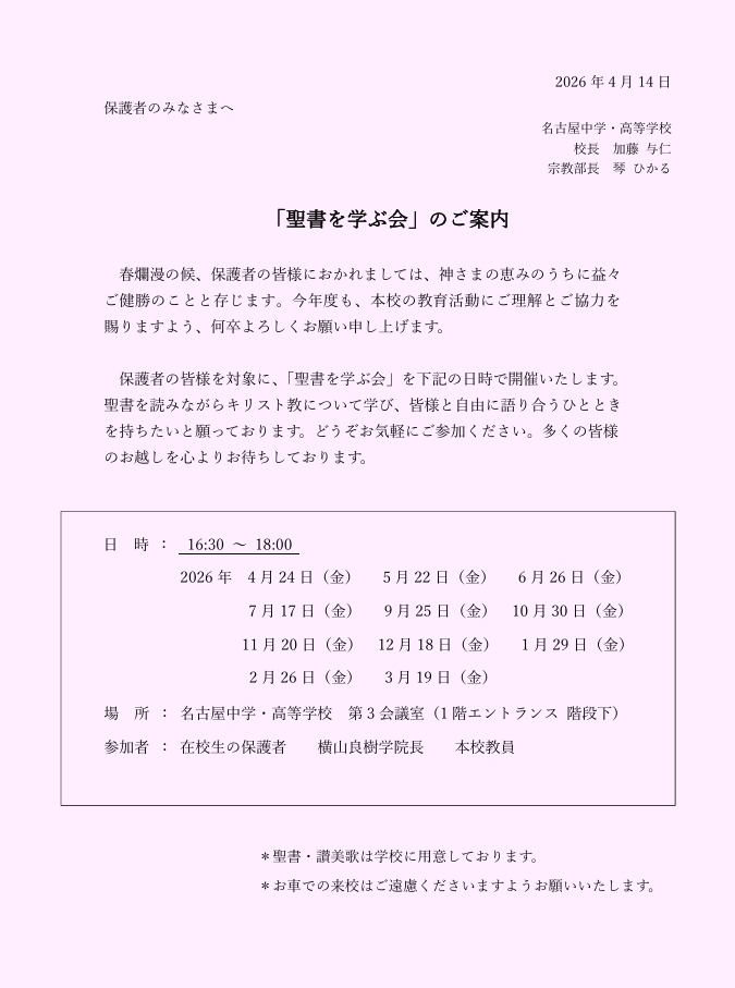 2026年度も、保護者の皆さまを対象とした「PTA聖書を学ぶ会」を開催いたします。