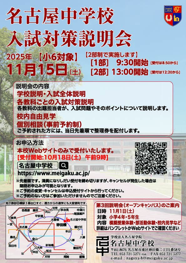 11月15日(土)の説明会(名中入試対策説明会)は小学6年生対象の事前予約制とさせていただきます。ご予約いただいていない方はご参加いただけませんのであらかじめご了承ください。